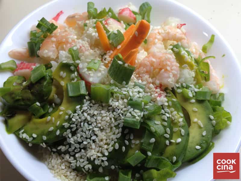 - Una vez cocido el arroz, servir en platos hondos, luego agregar las paltas cortadas en medias lunas, los camarones (y/o pollo, y/o centolla, y/o salmón en trozos), el cebollín cortado fino, Ciboullete picado y queso crema cortado en trocitos.