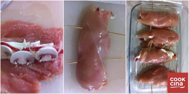 • Poner los ingredientes dentro de cada pechuga de pollo y agregar sal a gusto.