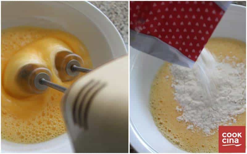 • Primero debemos batir los huevos, agregar la sal y los polvos de hornear hasta que la mezcla tome un color amarillo y espese.
