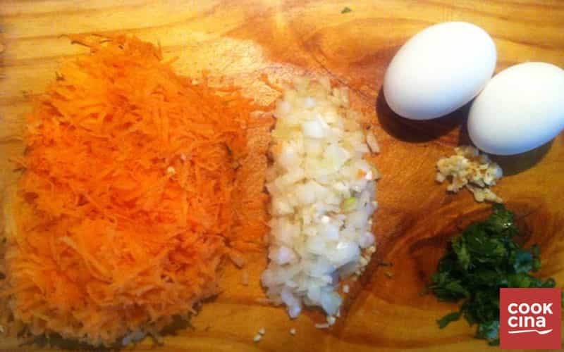 • Sofreír la cebolla con el ajo, luego de 5 minutos agregar la zanahoria y dar cocción por 5 minutos mas. Retirar y mezclar junto con las claras.
