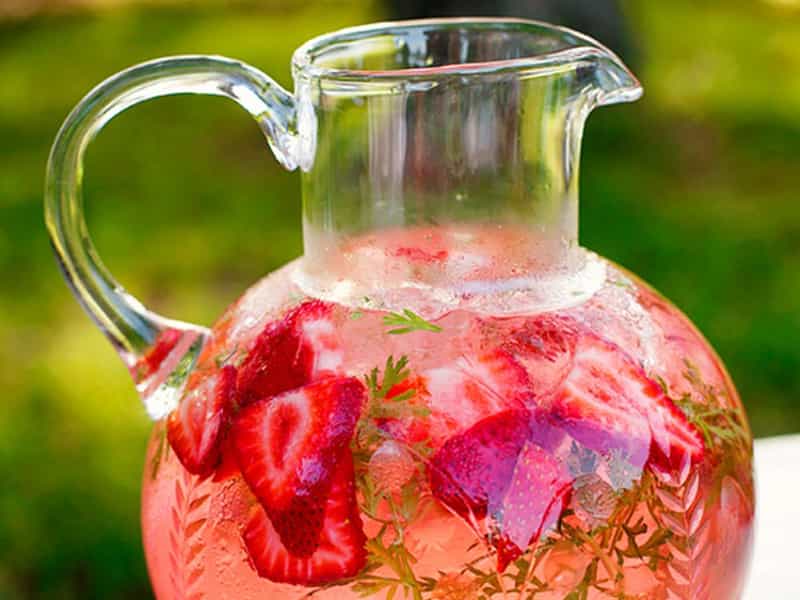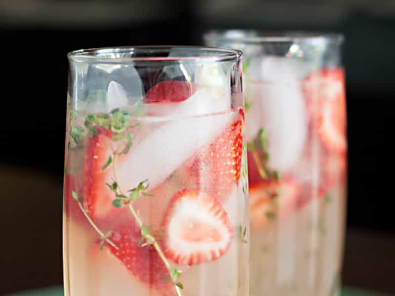 Limonada con frutilla y vodka (para 8 cocktails) Necesitan: 1 taza de azúcar 8 ramitas de tomillo 1 taza de agua ¼ de frutillas (o algún otro berrie) 1 ½ de jugo de limón 5 tazas de agua Preparación: En una olla agregar la taza de azúcar, las ramitas de tomillo y una taza de agua. PON La olla en el fuego, revolviendo ocasionalmente hasta que se disuelva el azúcar (esto toma unos 10 minutos). Cuanto esto esté listo, deja enfriar y saca las ramitas de tomillo. Corta las frutillas en láminas, échalas en un jarro y combínalas con el jarabe que acabas de preparar, más el jugo de limón y las 5 tazas de agua restantes. Déjalo reposar una hora, apróx. Para servir, agrega vodka a gusto, mucho hielo y decora los vasos con las ramitas de romero que reservaste.