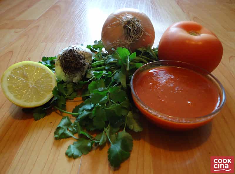 Preparación En un bowl colocar el cilantro picado muy finito y mézclalo con una cebolla picada en pequeños cubos. Luego agrega el tomate muy bien picado (al punto de quedar como una pasta) junto con el ajo. Este debes picarlo bien, ya que no es muy agradable masticar un pedazo de ajo entero Finalmente agregar el chorrito de limón y de vinagre más las dos cucharadas de pasta. ¡Y ya estás listo! Prepara tu propio pebre, agregando o sacando todo lo que se ocurra.