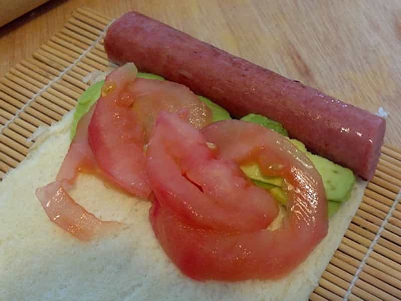Añadir la palta y el tomate, cortados finamente. Enrollar el pan tal como se hace con los roll de sushi. Cortar en rebanadas delgadas y presentar como rolls. Finalmente, se le puede agregar mayonesa, ketchup o mostaza. Si quieres unirte a la moda del sushipleto puedes ocupar el hashtag #Sushipleto en Twitter o visitar su página en Facebook.