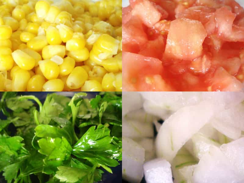 Luego corta los tomates en cuadritos, pica la cebolla finamente, corta las aceitunas y sácales los cuescos. Cuando tengas eso listo, junta todos los ingredientes en una fuente grande y agregar el choclo y el perejil. Revuelve todo, aliña con sal y aceite de oliva y tu ensalada estará lista para ser servida.