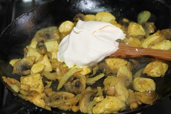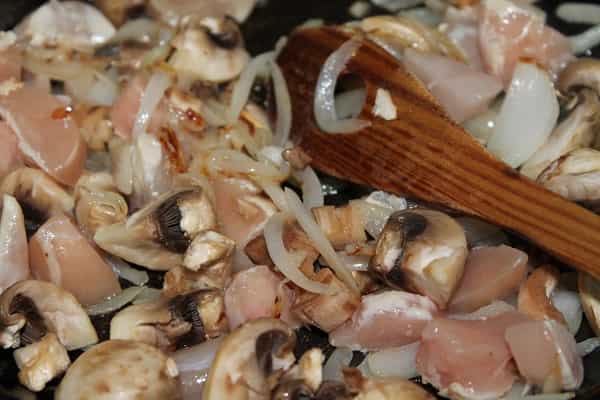 Añada el pollo y los champiñones y cocina por unos 3 minutos más.