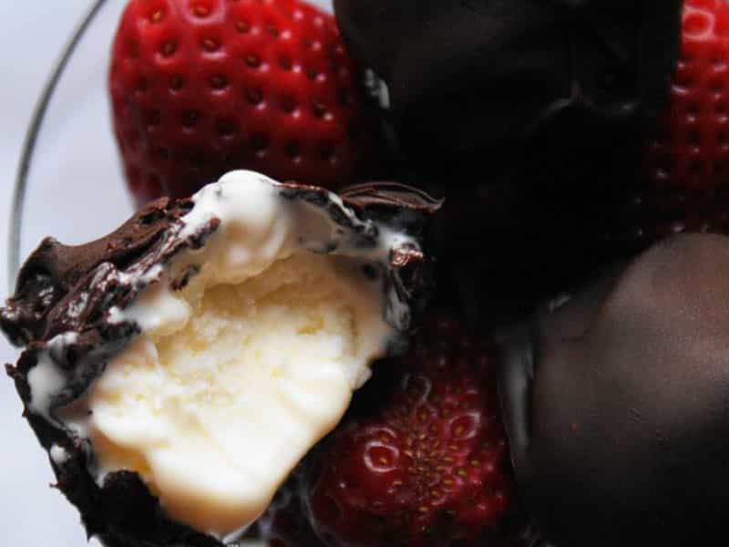 En invierno nuestra excusa para comer cosas ricas es el frío, en verano es simplemente por gusto. Los helados son para cualquier época del año, especialmente si les puedes dar en casa ese toque especial que los haga únicos, transformándolos en postres que sorprendan a tus invitados o para disfrutarlos como una delicia de esas que comemos frente a una buena película un domingo en la tarde. La receta es más que simple, solo necesitas un poquito de tiempo, dedicación y algunos materiales. Ingredientes (para 25 bombones) 2 tazas de helado del sabor que más te guste 180 gramos de chocolate de cobertura picado (ojalá semi amargo) 3 cucharadas de mantequilla o 3 cucharadas de aceite vegetal sin sabor 1 1/2 cucharada de miel de palma Cositas para decorar: pueden ser chispitas de colores, galletas molidas, coco rallado, maní picado, etc. Preparación Lo primero es preparar una bandeja con papel mantequilla y llevarla al freezer para que se congele. Por mientras llenar una taza con agua recién hervida y poner dentro la cuchara que utilizarás para servir el helado. Luego saca el helado y la bandeja del freezer y, con la cuchara caliente, saca bolitas de helado y anda poniéndolas sobre la bandeja fría. Cuando tengas todas tus bolitas lista, rápidamente vuelve a llevar la bandeja al congelador para que el helado se vuelva a endurecer. Espera unas 2 horas. Por otra parte, poner la cobertura de chocolate picada con la mantequilla o el aceite y la miel de palma en un recipiente y derretir todo a baño maría. Revuelve constantemente hasta que esté todo perfectamente derretido. Ahora empieza lo difícil. Es necesario ser súper rápidos. Por lo tanto, saca la bandeja con las bolas de helado del refrigerado y, ayudada con 2 cucharas, toma rápidamente cada una de las bolitas y pásalas por el chocolate, rotándolas y dejando caer el exceso. Poner las bolitas de vuelta en la bandeja fría y espolvorear con lo que quieran decorar (chispitas, coco, etc). Congela las bolitas de helado nuevamente durante unas 4 horas como mínimo o bien toda la noche (mucho mejor) y listo. Manténlas refrigeradas hasta el momento de servir. ¡Una delicia! Foto vía kitchen-maid