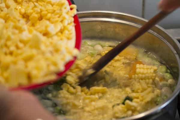 Déjalos a fuego fuerte unos 10 minutos y luego a fuego suave sobre un tostador, pero sin parar de vigilarlos para que no se sequen. Si esto ocurre puedes agregarles agua hirviendo. Cuando ya estén blandos agrega el choclo desgranado y el zapallo picado en cubitos. Mantén a fuego suave hasta que estén blandos.