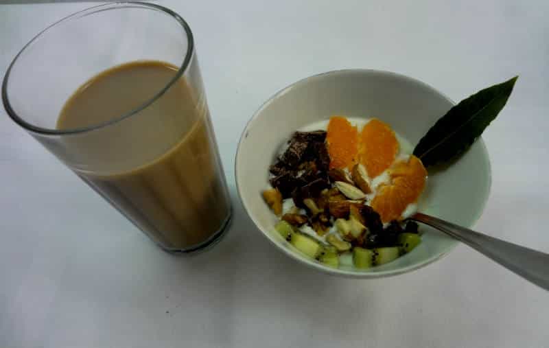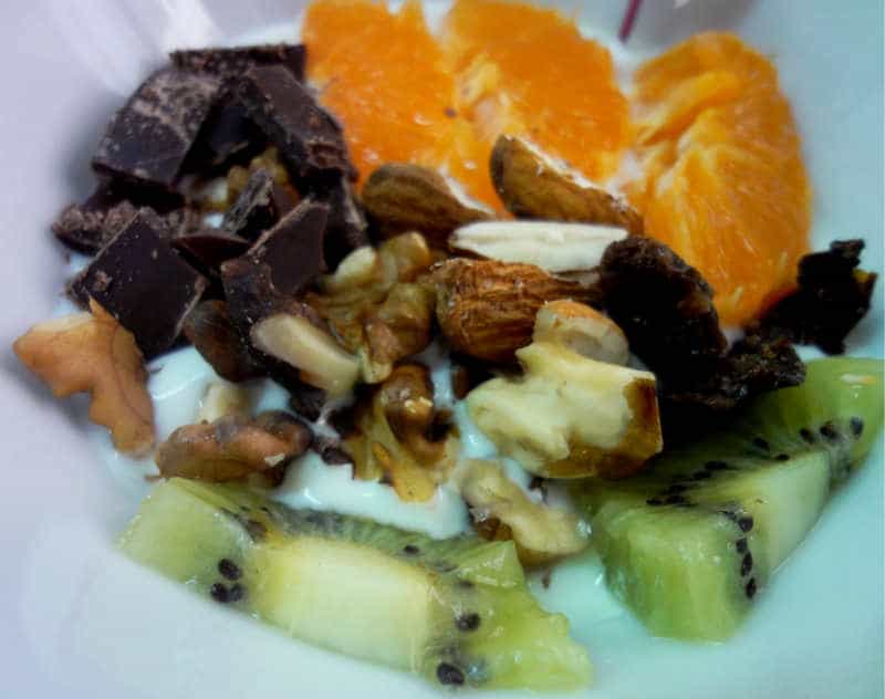Ingredientes -1 mandarina -1kiwi -1 yogurt natural -4 cuadritos de chocolate -nueces molidas -almendras molidas -pasas Preparación Corta a tu antojo los ingredientes anteriores y procede a mezclarlos en un bol. La cantidad depende exclusivamente de ti. Ahora si quieres que tu desayuno sea un poco más dulce, puedes agregarle un poco de miel. Acompaña esta mezcla de frutas, yogurt y chocolate con algún té o café con leche , y estarás listo para empezar el día. Un buen desayuno además de aportar energía, te entrega felicidad y una mente clara.