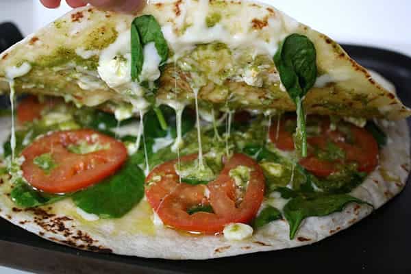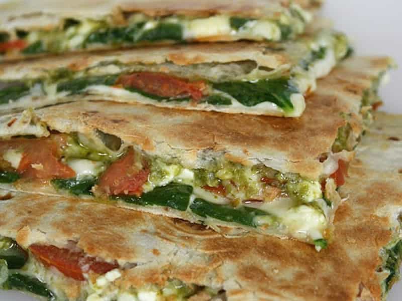 Esta receta es ideal para cuando quieres comer algo rico, pero que no te cueste mucho trabajo. Yo incluso me he llevado este plato para el trabajo y me funciona perfecto. Sin embargo, también es ideal para un picoteo rico con invitados en tu casa. El procedimiento y los ingredientes son bastante simples y, por supuesto, eres libre de cambiarlos por las verduras que encuentres en tu refrigerador. Acá les dejo una de mis versiones favoritas. Ingredientes (para 1 quesadilla grande) 1 tomate en rodajas finas Espinaca Pesto Queso mozzarella rallado 2 tortillas grandes de trigo (ojalá integral) Preparación Pon una de las tortillas en un sartén a fuego bajo a calentar, mientras la tengas ahí, añade una capa del Pesto que te enseñamos a hacer hace unos días (acá está la receta). Luego esparce queso mozzarella y añade el tomate cortado en rodajas delgadas. Posteriormente, agrega una capa de hojas de espinaca fresca y bien lavada y finaliza con una nueva capa de queso. Pon la otra tortilla encima y dala vuelta. Déjalas unos 5 minutos más al calor para que el queso se derrita y la nueva tortilla se termine de dorar. Recuerda que como siempre, cada receta es flexible y puedes rellenar tus quesadillas con los ingredientes que quieras. La gracia de que lleve queso es que ayuda a mantener todos los ingredientes más juntos. ¡Qué les quede rico!