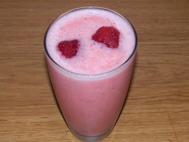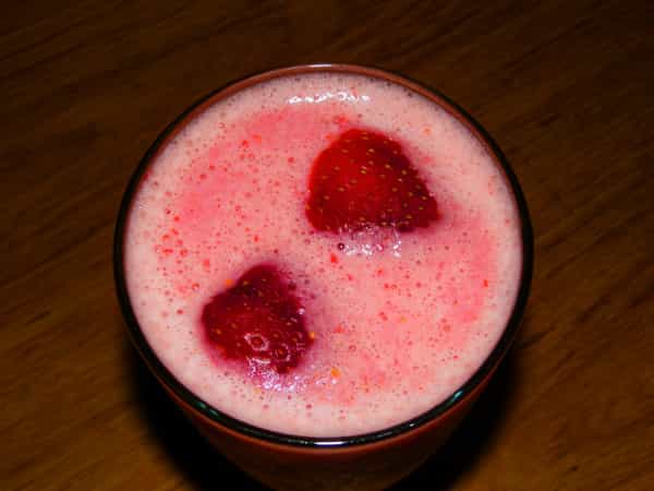Con la misma minipimer o en la juguera mezcla todos los ingredientes hasta que la frutilla se desintegre completamente. Si encuentras que es necesario puedes agregar endulzante. Sirve en un vaso grande y agrega dos frutillas grandes y lindas. Ahora, sólo disfruta.