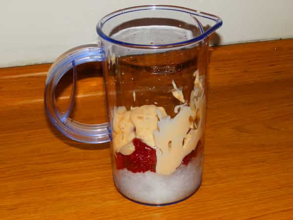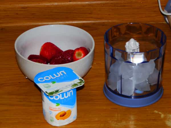 Preparación En una minipimer tritura los cubos de hielo hasta hacerlos frappé. Ponlos en un recipiente junto a las frutillas (o cualquier fruta que te guste), el yogurt y un vaso de agua de 200 cc.