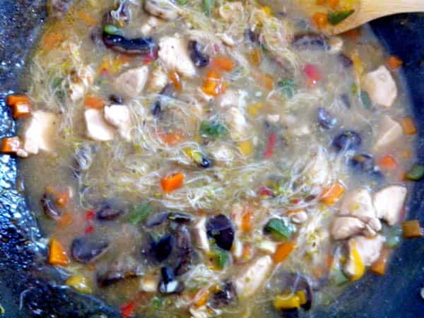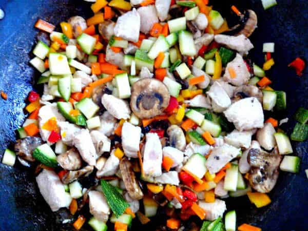 En un wok pon un poco de aceite, añade el pollo y los champiñones. Cocina durante un par de minutos el pollo hasta que quede blanco y añade 2 tazas de agua hervida. Espera a que se evapore casi totalmente.