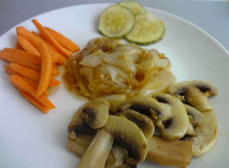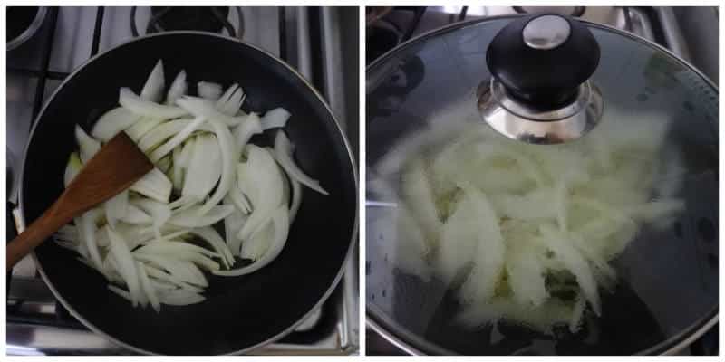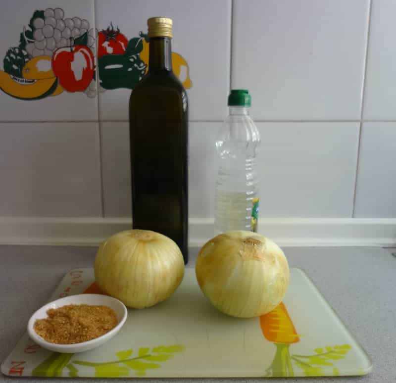 Ingredientes -2 cebollas -Aceite de Oliva -Azúcar morena (2 cucharadas) -Vinagre Preparación Pelamos las cebollas en juliana, esto quiere decir tiras finas por la mitad. Luego en un sartén calentamos un poco de aceite de oliva y freímos la cebolla hasta que se vaya ablandando y teniendo un color tostado. Procedemos a taparla e ir moviendo y agregando aceite según sea necesario (20 minutos aprox)