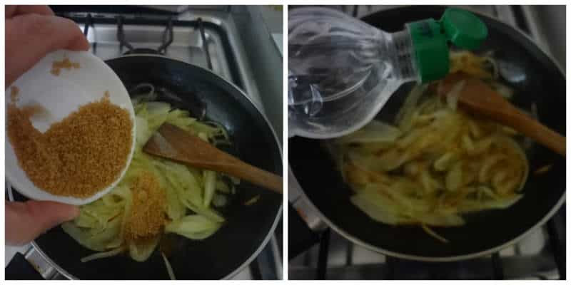 Cuando la cebolla se haya ablandado y cambiado un poco de color, agregamos el azúcar morena. Revolvemos sin parar y luego agregamos un poco de vinagre. Mezclamos todo bien, y dependiendo del gusto de cada uno, también se le puede agregar un poco de sal.