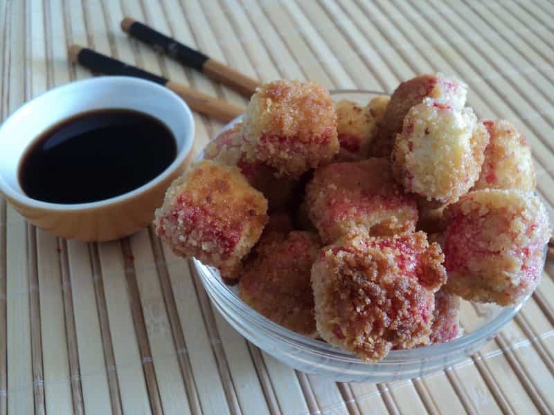 Cuando hayas terminado con todos los kanikamas, coloca el suficiente aceite en un sartén, como para freír una escalopa. Gira los cubitos para que se frían bien y deposítalos en una fuente con toalla absorbente para que pierda el aceite. El kanikama tomará una textura increíble, esponja y Sueve. Ahora, disfruta de tus kanikamas furai con las salsas que desees, sea salada o agridulce, y te lucirás con tus invitados.