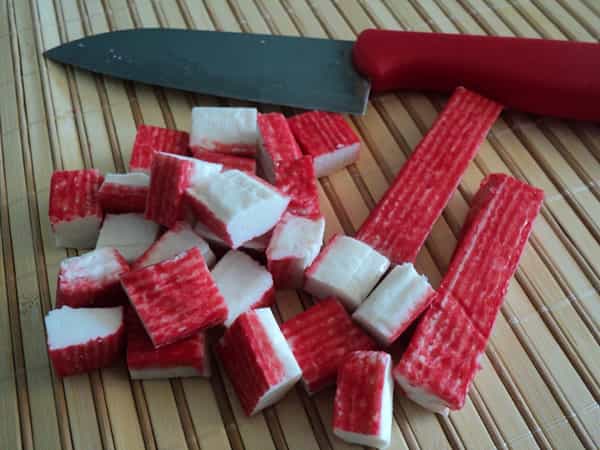 Preparación Lo primero que debes hacer es picar los kanikamas. Idealmente corta el bastón en 4 partes para que rindan mucho más. Puedes darle el corte que tú quieras, pero como los ocuparemos para picoteo es mejor que sean más pequeños y cómodos para comer.