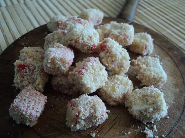 En un recipiente, mezcla el huevo con la sal y la pimienta. Luego vierte todos los cubitos de kanikama que tengas, hasta que queden todos bien impregnados de huevo. Por mientras coloca el pan rayado en un plato para luego apanar nuestros kanikamas. Retíralos al huevo de a uno y pásalos por el pan. Una vez terminado este proceso espera que se sequen un poco y vuelve a repetir la operación. De esta forma, nos aseguraremos de que los kanikamas queden bien apanados.
