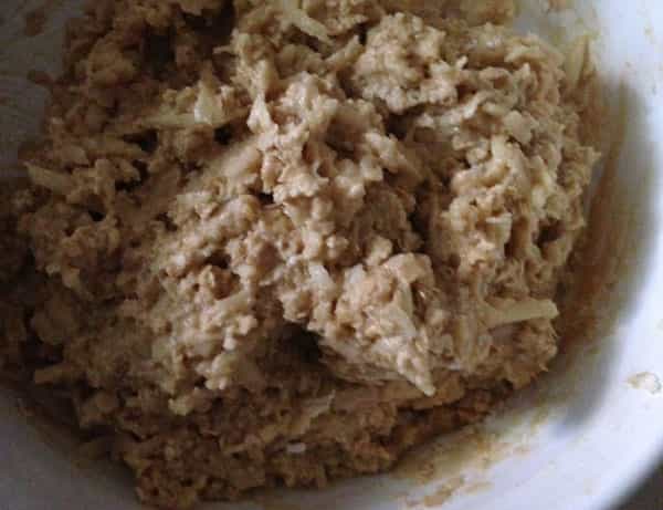 Mezclar en un bowl los 150 grs. de azúcar con la mantequilla a temperatura ambiente, luego agregar el huevo y miel de palma hasta que quede homogeneo e incorporar la harina, avena y manzana rayada. Mezclar bien.