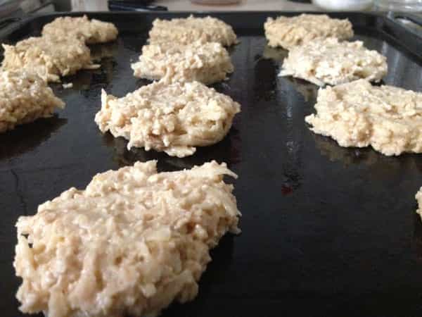 Precalentar el horno. Con un poco de aceite cubrir la lata de horno y disponer bolitas de masa con la ayuda de una cuchara, con la parte trasera de la cuchara aplastar la masa para darle la forma de galleta. Hornear por 20 minutos.