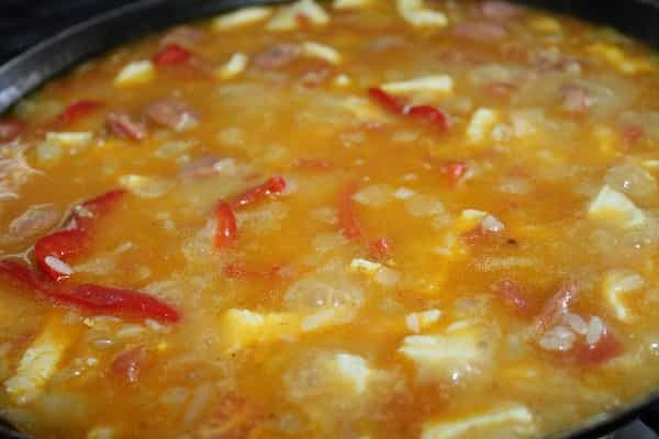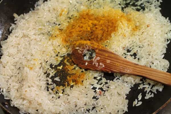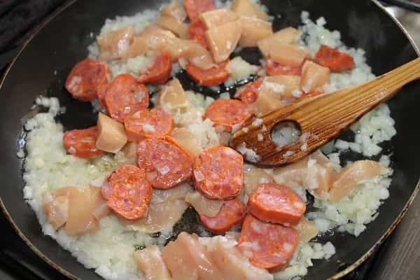 Cuando el pollo comience a tomar color retiramos del fuego y echamos los ingredientes ya sofritos en un plato. De esta forma podremos usar el mismo sartén para sofreír el arroz a fuego medio (si la mezcla de aceite con mantequilla que quedó no es suficiente agregar un poco más de aceite de oliva).