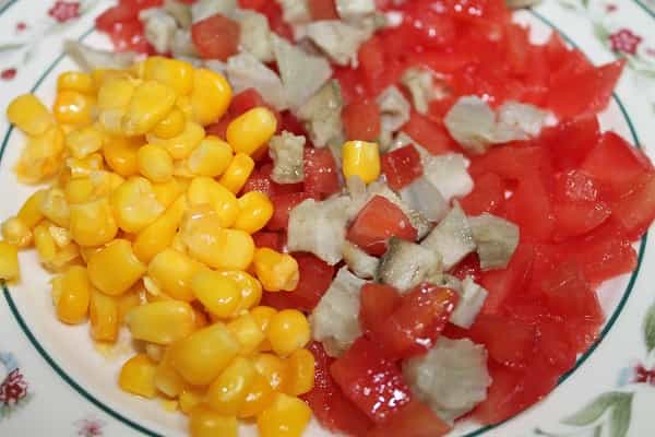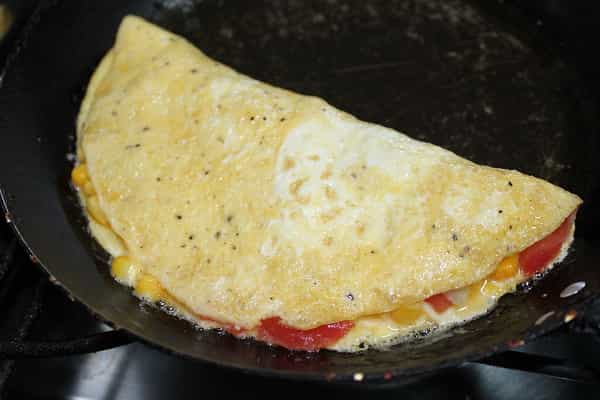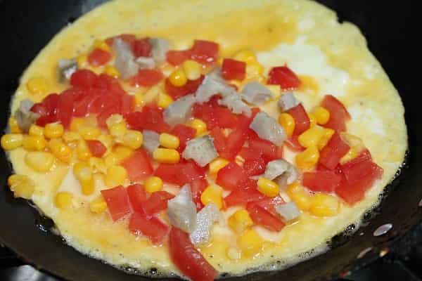 La gracia de la tortilla francesa u omelette es que se puede rellenar con los ingredientes que se nos ocurran, según la temporada, nuestros gustos y antojos. Y como los días ya nos anuncian que el verano se nos acerca a pasos agigantados, qué mejor que escoger verduras ricas en nutrientes que le dan un toque fresco a nuestra tortilla. Ingredientes -1 Cucharada de mantequilla -2 Huevos -1 Lámina de queso -1 Fondo de alcachofa -1 Cucharada de choclo -Sal y pimienta Preparación Para comenzar debemos picar en cuadritos los ingredientes de nuestro omelette; el fondo de alcachofa y el tomate.