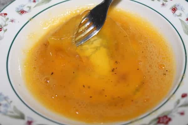 Luego debemos batir los dos huevos enteros con un poco de sal y pimienta mientras derretimos la mantequilla en un sartén, ojalá antiadherente.