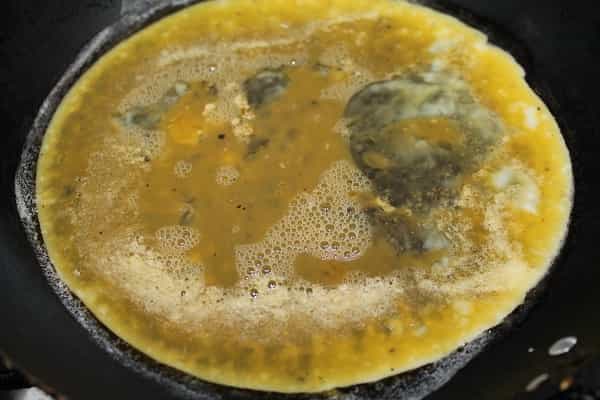 Cuando la mantequilla esté derretida y cubra todo el sartén, agregamos los huevos ya batidos y dejamos que se cocinen por unos minutos, hasta que observemos que la mezcla cuajó.