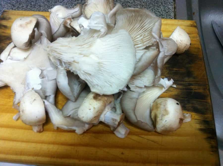 Salsa: Corta la cebolla en brunoise (cubitos pequeños). Corta los champiñones en cuartos.