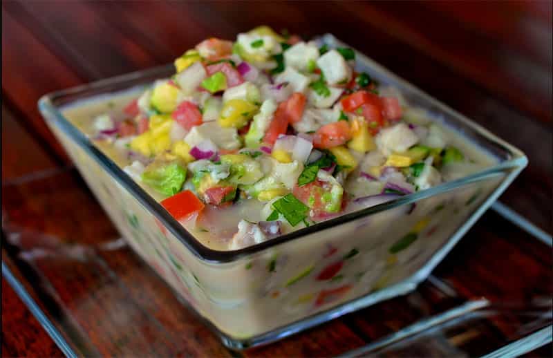 Esta es una receta que no falla y que todos los invitados van a quedar con gusto a poco. Es más, la última vez que lo hice, mi vecina que había venido el viernes a comer a mi casa, llego a mi casa el sábado pidiéndome lo que quedaba para sus invitados al almuerzo. Ingredientes: -1kg pescado fresco (corvina, robalo, salmón etc, o mezcla de los 3), cortado en cuadros pequeños -1 cebolla roja, picadas finamente ( puede ser 1/2 blanca y 1/2 roja ó 1blanca) -2 dientes de ajo -2 pimientos de distintos colores, picados finamente -15 limones, de preferencia de pica. -1 manojo de cilantro o culantro, picado finamente -1 ají rocoto chico -1 taza de leche de coco -Ralladura de limón -1 cucharada de mayonesa -Jengibre en polvo, sal, pimienta, salsa de soya y aceite de sésamo al gusto Preparación: Ponga los pedacitos de pescado, los pimentones y la cebolla crudo en una fuente de vidrio y cúbralos con sal y el jugo de 10 limones, el pescado debe estar completamente cubierto por el jugo de limón. Tape la fuente con plástico de cocina y póngalo en refrigerador durante por lo menos 4 horas o hasta que el pescado este completamente “cocido” por el limón. Aparte, en un procesador de alimentos poner la cucharada de mayonesa, la leche de coco, el aceite de sésamo, el aji (sin semillas, recuerde que el picor del ají esta en las semillas), el manojo de cilantro ó culantro, la salsa de soya, el jengibre en polvo . Procesar todo eso, hasta que quede como una crema y agregue a la preparación del ceviche Mezcla todos los ingredientes, para que la crema se mezcle con los demás ingredientes y agrega el jugo de los 5 limones restantes, la sal y la pimienta negra. Y vuelve a dejar reposar por una hora en refrigeración. Foto CC Vía Flickr James