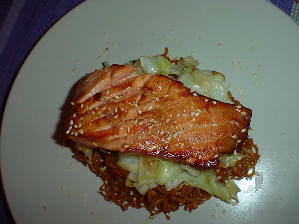Preparación En un fuente refractaria, condimenta el salmón con el ajo, el aceite y el jugo de limón (no le pongas sal al samón). Cubrelo con papel alusa (aluminio) y lo metes al horno por 20 minutos a 180°c. Mientras tanto, en una olla pone todos los ingredientes de la salsa, menos el almidón de maíz, hasta que suelte el primer hervor. Baja el fuego y agrega el almidón de maíz disuelto en agua (pero si sacas un poco de la salsa tibia y con eso disuelves el almidón quedará mejor) y los revuelves constantemente hasta que espese. Destapa el salmón y vierte la salsa encima. No lo vuelvas a cubrir, y vuelve a meterlo al horno por 10 minutos ó esta que el salmón se dore y que la salsa se espese y quede acaramelado (¡no quemado!) Antes de servir esparce semillas de sésamo sobre el salmón. Foto CC Vía Flickr Su-Lin