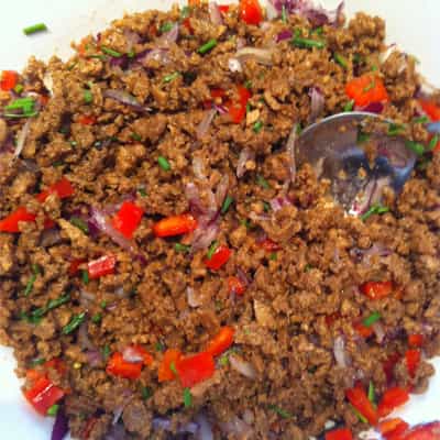 Mezcla todos los ingredentes que ya has preparado en un bowl. Agrega sal, pimienta, curry, orégano y ajo en polvo a tu gusto. Revuelve. Toma dos huevos y bátelos con fuerza en un bowl pequeño y agrégalos a la carne. Para finalizar, agrega un poco de harina de linaza para que las albóngidas tomen consistencia. En el caso de que no tengas harina de linaza, ¡no te preocupes! Puedes reemplazarla por un poco de pan rallado o harina integral.