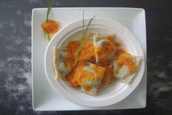 Se pone a hervir agua y se van cociendo en porciones por 3 minutos aproximadamente. Salsa Pelar el tomate, el diente de ajo y la cebolla. Cortar todo en cubos, poner en la juguera y moler. Vaciar la mezcla en una olla y sazonar a gusto, añadiendo el orégano y el azúcar, y si es necesario el aceite de oliva, y cocinar hasta que reduzca un poco. Reservar. Para terminar, sólo queda ubicar tus ricos raviolis en platos, verter la salsa y, si quieres, agregar queso rallado a gusto. ¡Ahora, a disfrutar!