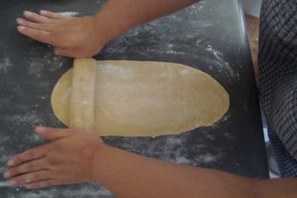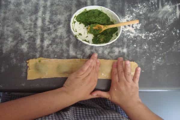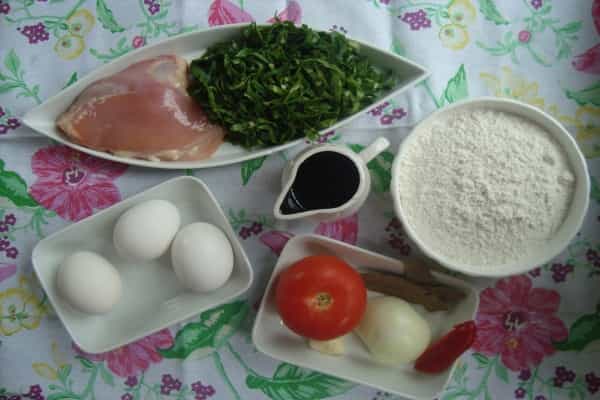 Masa - 500 grs. de harina sin polvos de hornear - 5 yemas - 1 cucharadita de sal - Agua tibia Relleno - 1 pechuga de pollo - 2 espinacas - 1 ajo - Sal, pimienta y merkén Salsa - 3 tomates - 1 cebolla - 1 diente de ajo - Sal a gusto - 1 cucharada de azúcar - 1 cucharada de orégano Preparación Relleno Cocinar el pollo con un diente de ajo y una pizca de sal. Retirar el pollo y reservar. Guardar el caldo. Blanquear la espinaca: colocar las espinacas en un colador y dejar caer agua hirviendo. Reservar. Cuando el pollo y la espinaca estén fríos, moler en una procesadora o en la juguera. Si es necesario, agregar el caldo de pollo. Debe quedar una pasta consistente, no líquida.