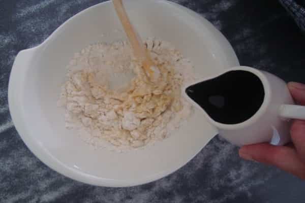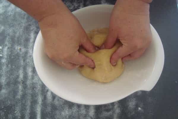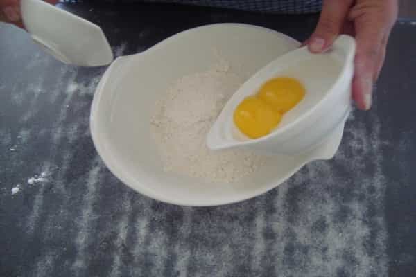 Masa En un bol, se mezcla la harina con la sal y las yemas, y se hace una masa homogénea. Si es necesario, se agrega un poco de agua para unir los ingredientes.