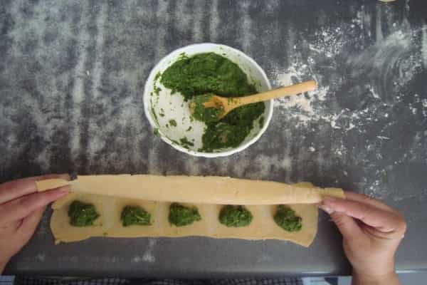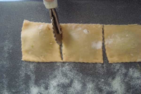 Se estira la masa y se pone el relleno en porciones, el cual preparamos previamente. Se tapa con otro trozo de masa y se cortan los raviolis en cuadrados.