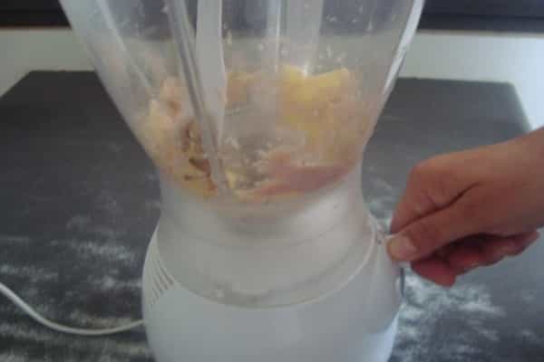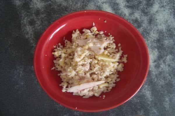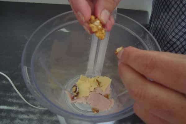 Relleno: Picar las nueces, el queso y el jamón, para luego molerlos en una juguera o procesadora, agregando crema si fuera necesario y cuidando que la pasta no quede líquida.