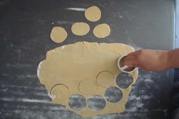 Salsa: Mezclar la mantequilla con la leche y la maicena en frío. Añadir sal y pimienta a gusto, y poner a fuego suave, revolviendo constantemente hasta que empiece a espesar. Agregar la salsa de tomates y el tomate picado. Retirar del fuego y reservar. Armado: Una vez estirada la masa, cortar círculos (5 a 8 cm. de diámetro aproximadamente), poner el relleno al medio de cada uno, mojar el contorno con agua y poner otro círculo de masa encima, presionando los extremos para unirlos. Si es necesario, presionar del borde con un tenedor.