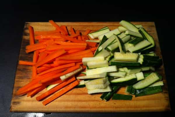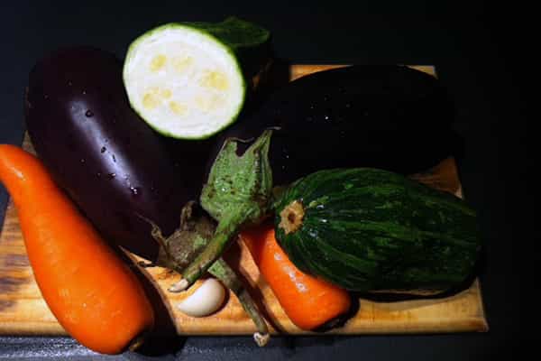 - 2 berenjenas - 1 zapallo italiano - 2 zanahorias - 1 tomate - Ajo - Opcional pimentón rojo o champiñones - Salsa de soya - Aceite de oliva - Sal - Pimienta Preparación: Corta la berenjena en bastones gruesos, de 1 por 4 cms. Corta el zapallo y la zanahoria en bastones.