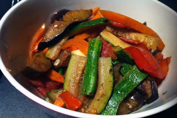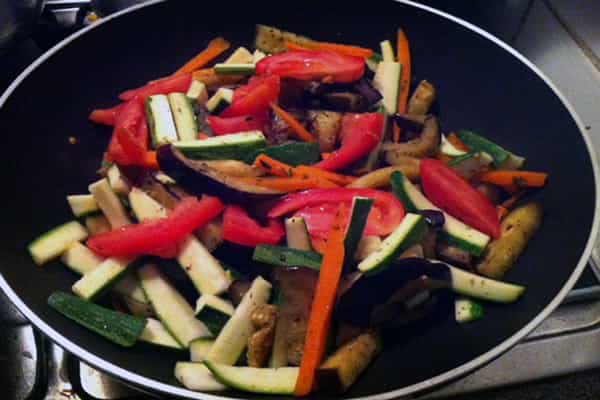 Corta el tomate en gajos y el ajo en brunoise (cubitos pequeños). Pone a calentar el wok y cuando esté muy calienta, agrega un poco de aceite de oliva, el ajo y las berenjenas. Dora el ajo por ambos lados, por 5 mins. aproximadamente, y agrega la zanahoria. Si se empieza a quemar, agrega media taza de caldo de verduras. Agrega el zapallo italiano y el tomate.