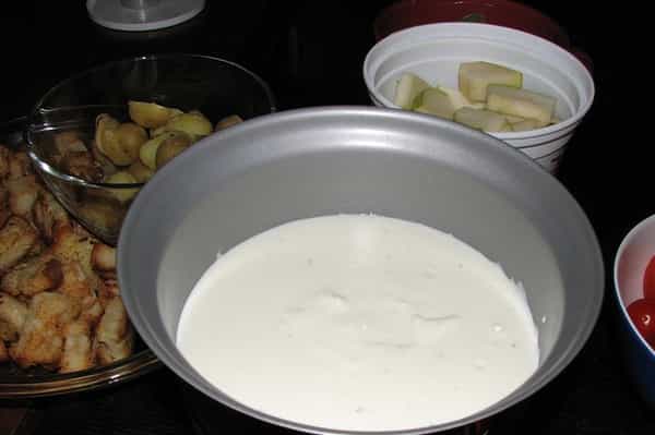 4) Fondue: Ingredientes (2 personas): - 1 taza de vino blanco. -1 diente de ajo molido. - 500 grs. queso Gruyére o Emmenthal rallado. - 2 cucharaditas kirsch o pisco. - ½ pan baguette cortado en cubitos. Preparación: 1.Coloca el vino y el ajo en una fuente. Cocina destapado por 5 minutos. 2.Coloca el queso en el procesador de alimentos y agrega el vino. Trabaja por 2 minutos. 3.Coloca el queso y vino en la fuente y cocina destapado por 2 minutos. Revuelve y cocina por otros dos minutos. 4.Agrega el kirsh y sirve inmediatamente con el pan.