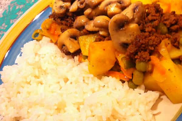 Sirve tu estofado acompañado de arroz blanco perfectamente graneado. En mi caso, lo serví además con un poco de carne de soya que tenía previamente cocinada con un poco de cebollín y salsa de tomate. ¡La combinación queda deliciosa! ¡Que lo disfrutes!