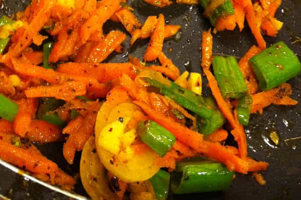 Ahora, sigue con las verduras: ralla las zanahorias y pica en pequeños trozos la cebolla, el cebollín, el ajo y los tomates y sofrielos en aceite de oliva bien caliente. Luego añade tus especias: curry, comino, pimienta negra, orégano y merquén. Si te gusta lo condimentado, sé generoso, porque en esta parte es donde el estofado adquiere todo su sabor.