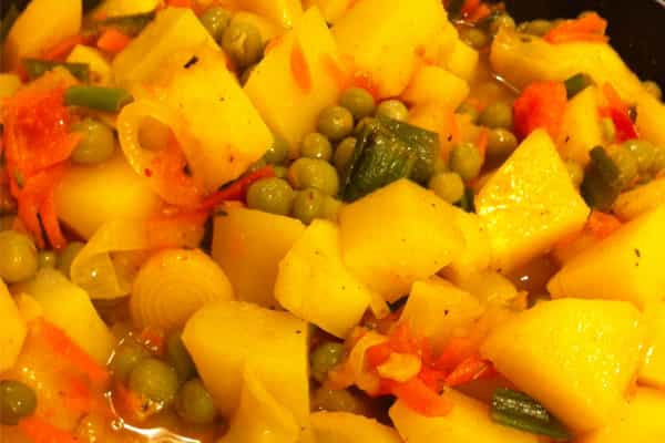 Hace un par de días que ya venía con muchas ganas de comer un contundente y especiado estofado, de esos humeantes y muy picosos. A pesar de que acá sigue reinando el calor, creo que este tipo de comida es muy reconfortante y, si se acompaña con una buena ensalada, puede ser una perfecta alternativa para el verano. Ahora, si además ese estofado tiene como protagonistas a unos deliciosos y saludables champiñones… ¡Definitivamente hay que probarlo! Ingredientes (para 4 porciones) - 1 bandeja de champiñones - 6 papas medianas - 2 zanahorias - 2 dientes de ajo - 2 tomates - 100 gr de arvejas - 2 cebollines medianos - 3 cucharadas soperas de salsa de tomate - Aceite de oliva - 2 cucharadita de curry - 1 cucharadita de comino - Pimienta negra, orégano, merquén, eneldo y sal a gusto - 1 taza de carne de soya (a elección) Preparación Pela, lava y corta en cuadritos las papas. Colócalas en una olla con agua y sal, y llévalas a fuego durante 15 minutos o hasta que estén blandas en el exterior y no en el centro. La idea es que luego se sigan cocinando junto a las verduras del estofado.