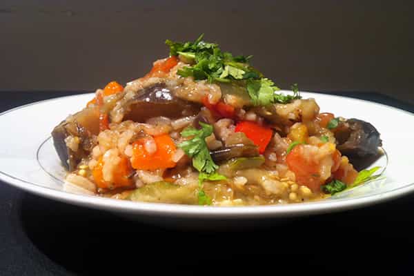 En esta época en que las berenjenas bajan su precio y es la estación ideal para encontrarlas fácilmente en todos lados, igual que los zapallos y choclos, te saldrá muy a cuenta cocinar un rico y sano guiso de berenjenas. Es un plato muy económico, ya que rinde mucho. Además, mi receta personal lleva arroz así que más aún. Ingredientes para 4 porciones: - 3 berenjenas grandes - 1 zapallo italiano - 3 zanahorias - 1/2 cebolla - 1/2 pimentón rojo - 2 tomates - 2 dientes de ajo - 1 taza de arroz - 2 1/2 caldo de verduras - 40 grs. de queso rallado - Comino - Orégano - Aceite de oliva - Sal - Pimienta Preparación: Cocina la taza de arroz como se prepara comúnmente para cualquier guarnición. La preparación clásico de arroz blanco. Lava bien todas las verduras. Corta la berenjena en medios rondeles con cáscara y todo su interior.