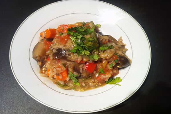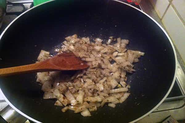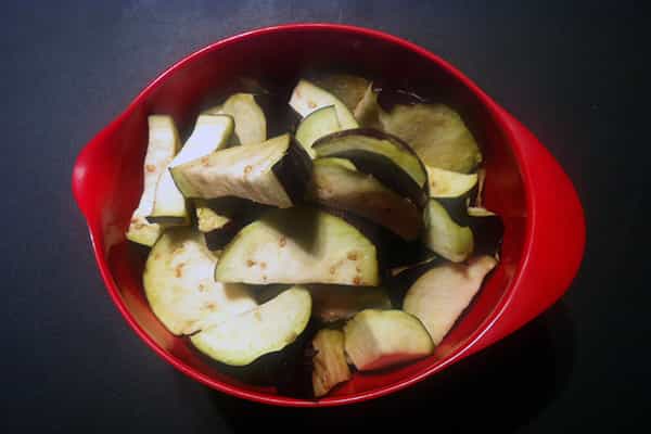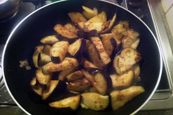 Luego agrega las berenjenas y saltéalas por 15 minutos. Agrega 1/2 caldo de verduras si es necesario para que no se queme.