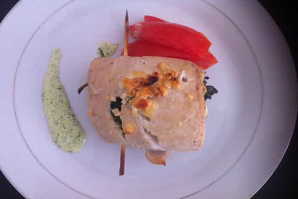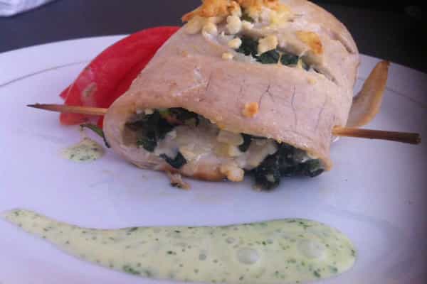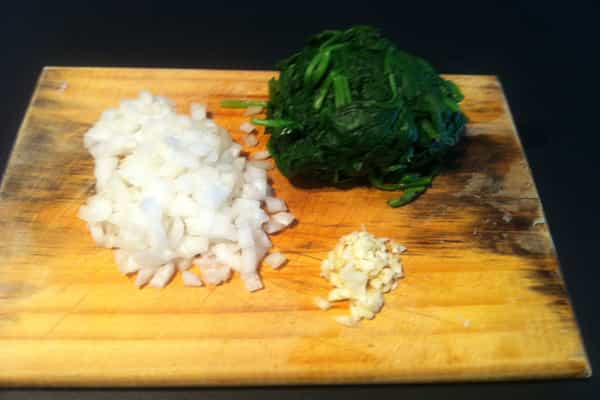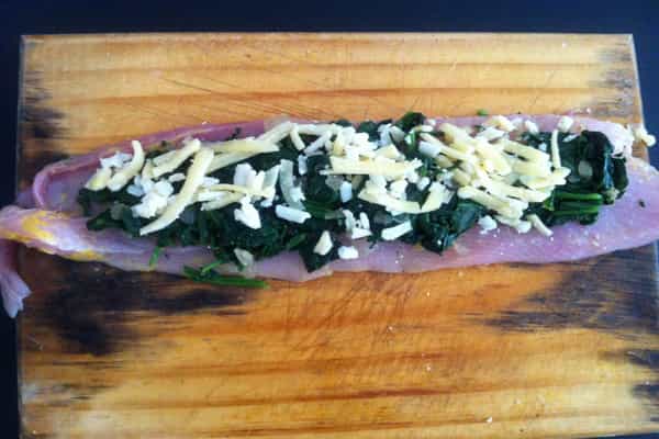 Mientras corta la cebolla y el ajo en brunoise (cuadritos pequeños). Limpia las hojas de espinaca y cuece en una olla con sólo 1 cm. de agua hirviendo, con el propósito de que se logre la cocción al dente sólo con el vapor del agua. Retira la espinaca y enfría enseguida para cortar la cocción. En una sartén caliente, agrega un poco de oliva, seguido por el ajo y la cebolla, sofríe y agrega las espinacas cocidas y picadas. Dispone de la mezcla anterior en el centro de los filetes ya marinados, y agrega el queso rallado.