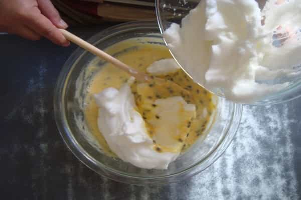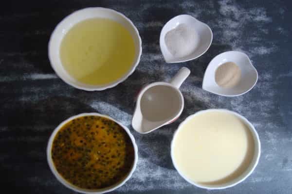 - 1 taza de Leche Condensada - 1 taza de pulpa de maracuyá - 1 cucharadita (7gramos) de gelatina sin sabor - 4 claras - Salsa de maracuyá . 3 cucharadas de azúcar . 3 cucharadas de pulpa de maracuyá . 50 mililitros (ml) de agua Preparación mezcla En un recipiente mezclar la leche condensada con la pulpa de maracuyá (puede ser con una batidora, en la licuadora o a mano), hasta obtener una mezcla homogénea. Disolver la gelatina sin sabor en ½ taza de agua caliente. Reservar. Batir las claras a nieve, deben quedar firmes. Reservar. Agregar la gelatina disuelta a la mezcla de la leche y maracuyá, mezclar. Incorporar las claras batidas con movimientos envolventes (suavemente) hasta que todo esté bien incorporado. Verter la mezcla obtenida en moldes individuales y refrigerar por mínimo dos horas.