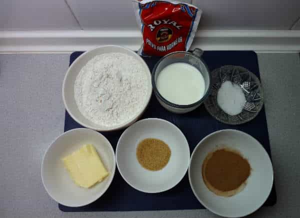 Ingredientes Para la Masa -2 tazas de harina (integral o blanca) -3 cucharaditas de polvo de hornear -1/2 cucharadita de sal -2 cucharadas de azúcar -1/2 taza de mantequilla -2/3 de leche Relleno -3 cucharadas de mantequilla derretida -2/4 de taza de azúcar - 3 cucharadas de canela (o más dependiendo de tu gusto) Glaseado -2/3 de taza de azúcar flor -Leche Preparación En un bol mezcla todos los ingredientes secos (harina, polvo de hornear, sal, azúcar). A continuación, ponemos la mantequilla un poco derretida y la mezclamos con los ingredientes de la masa. Puedes mezclar con un tenedor o batidora, lo importante es obtener una masa homogénea. Procedemos a agregar la leche hasta que se forme una masa esponjosa. La cantidad de leche puede variar, lo importante es obtener la consistencia deseada.