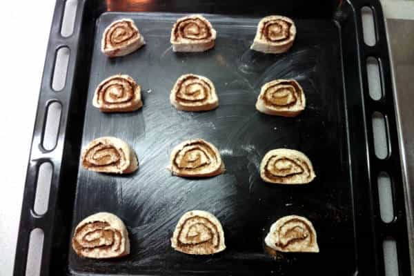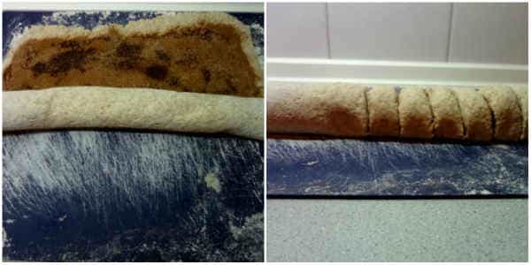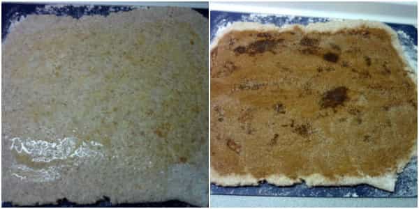 Estiramos la masa en forma rectangular sobre una superficie enharinada (grosor aprox 7 mm). Agregamos la mantequilla derretida sobre la parte superior de la masa. Para el relleno mezclamos la canela con el azúcar y luego espolvoreamos sobre la mantequilla.