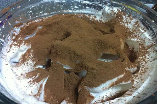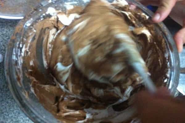 Luego, con la ayuda de un cernidor agrega el cacao y mezcla con movimientos envolventes hasta que quede homogéneo.